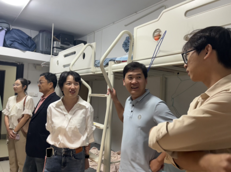 李岚书记走访了我院2022级部分本科生宿舍和2023级研究生宿舍。走访本科宿舍过程中,李岚书记与同学们进行亲切交谈,了解学生的返校过程及报到后的感受。李岚书记详细询问了我院回迁的2022级本科生对学校住宿条件、生活环境的适应情况,耐心倾听同学们对于住宿问题的反馈,积极与校后勤办协调沟通,并提出解决办法。
