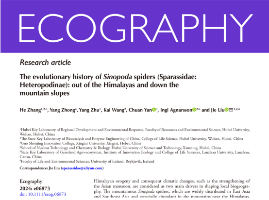 xg111net太平洋在线游戏刘杰教授团队近日在《Ecography》(中科院SCI一区,IF = 5.4)上发表了题为“The evolutionary history of Sinopoda spiders (Sparassidae: Heteropodinae): out of the Himalayas and down the mountain slopes”的学术论文。