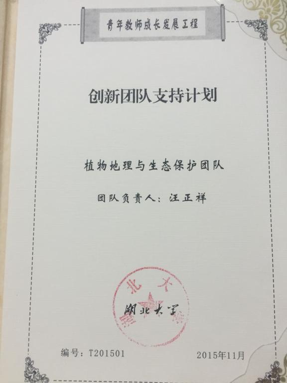 植物地理与生态保护创新团队(负责人汪正祥教授):本团队入选“湖北大学创新团队支持计划”,团队成员10人。团队研究方向立足植物地理科学前沿问题和国家需求,以生物多样性、生态系统的保护与恢复为目标,系统开展全球变化背景下亚热带森林生态系统、西北干旱区及长江中下游湖泊与高山泥炭藓湿地生态系统的时空格局、植被、生物多样性、生态过程与生态效应等研究。近8年来主持国家自然科学基金12项、国家支撑计划和基础工作专项各1项、教育部国家精品课程建设项目1项、环保部生物多样性保护专项5项。横向项目60多项。先后在Global Change Biology、Journal of Evolutionary Biology、New Phytologist、Functional Ecology等著名期刊上发表高水平SCI论文多篇,出版专著8部、教材2部、科普专题片1部。团队成员积极开展《植物地理学》课程建设,主持的《植物地理学》课程成为国家精品课程和湖北省精品资源共享课,并获湖北省人民政府教学成果二等奖。团队负责人先后主持1个国家公园、8个国家级自然保护区、8个国家湿地公园、1个国家森林公园以及多个省级自然保护区、湿地公园的科学考察或总体规划,为湖北省的生态环境保护与恢复做出了突出贡献。
